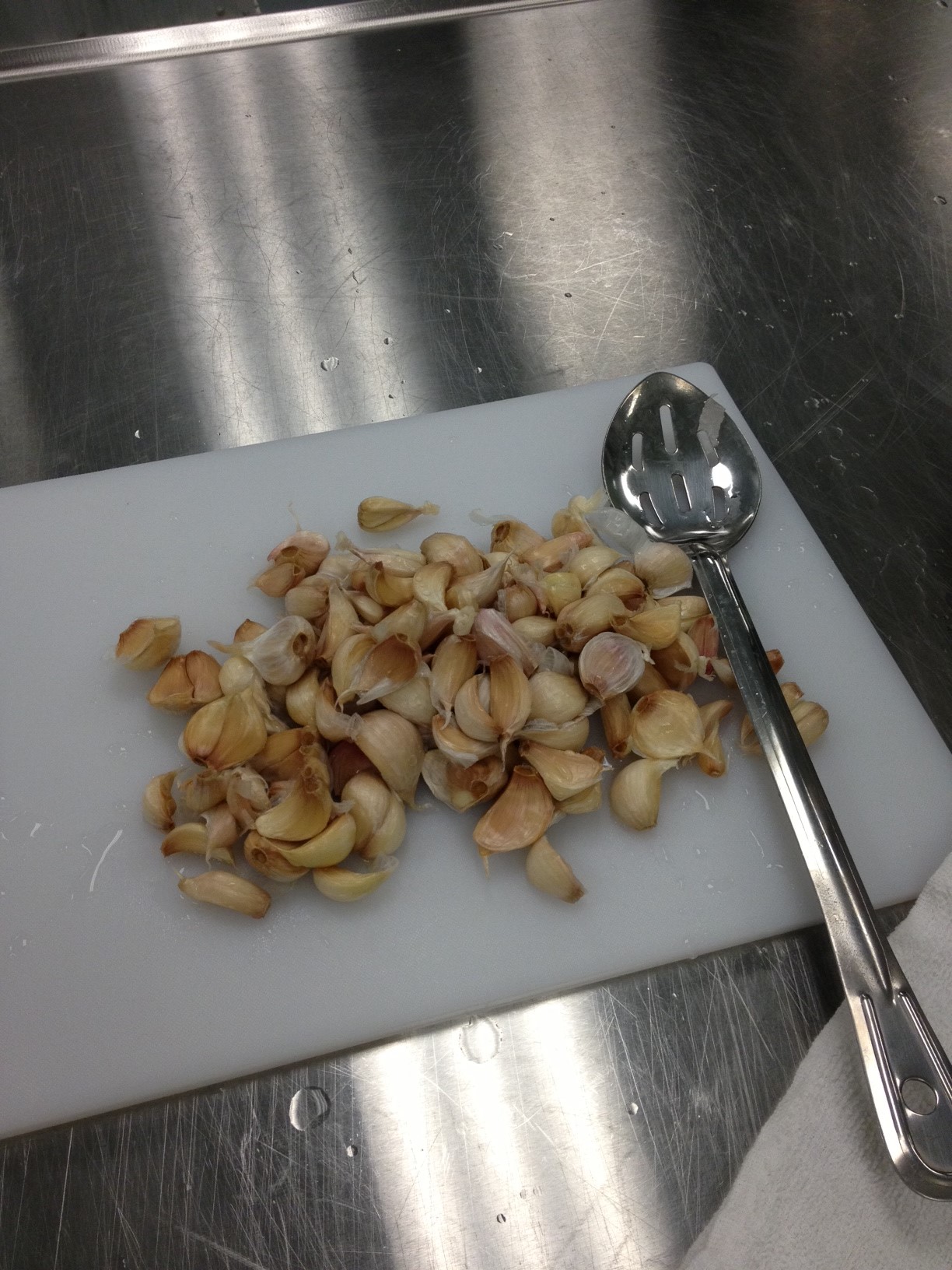 Tip: Remove the garlic from the base of the bulb so that each skinned clove is separated. With skins on, blanch the cloves in boiling water for 1 minute being sure to stir so each clove is thoroughly wet. Remove the cloves using a large slotted spoon and plunk them in ice cold water. Drain. To peel, hold the clove in one hand and pairing knife in the other; using your thumb and knife, cut the base of the clove and pull skin off towards you.