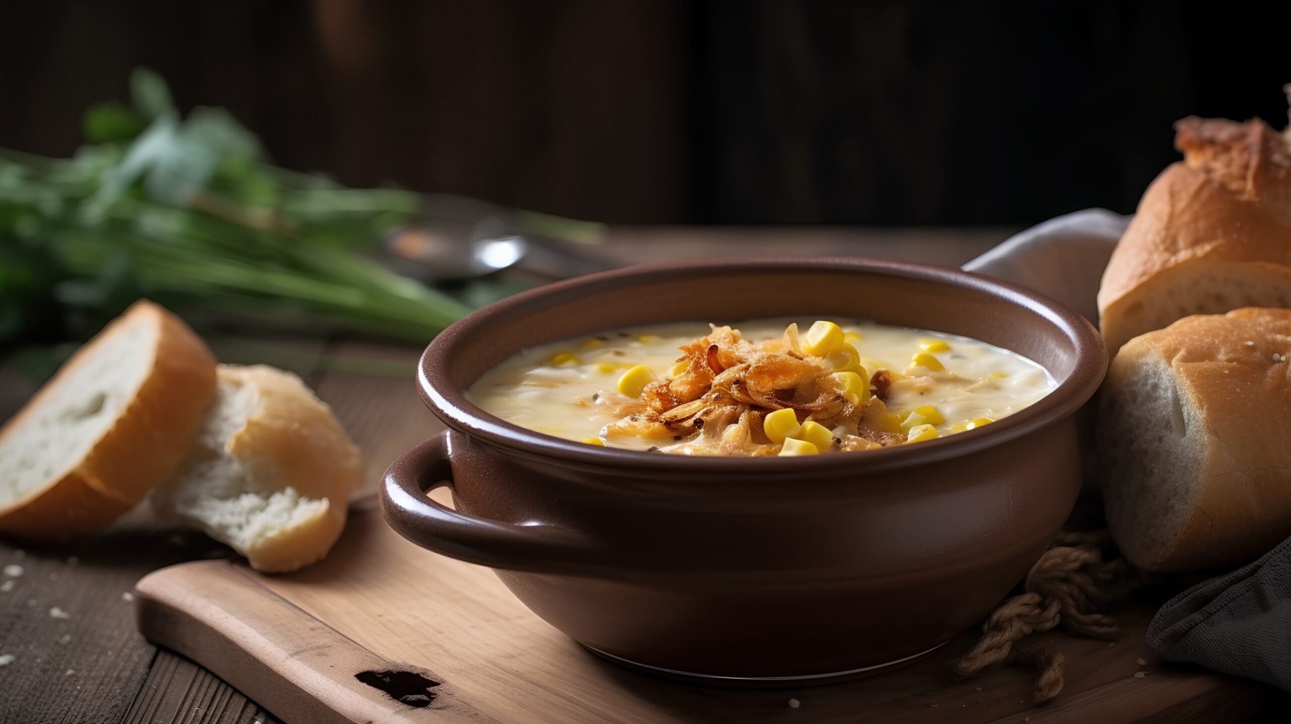 Corn chowder is a traditional American soup likely originating in New England, particularly among early settlers who relied heavily on locally available ingredients. The dish was likely inspired by Native American culinary traditions, as corn was a staple food for many Native American tribes in the region.