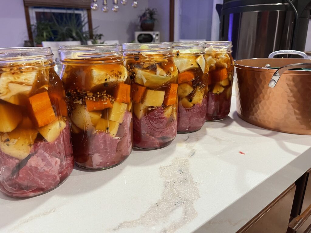 Enjoy St. Patty’s day all year ’round with this authentic corned beef and cabbage meal in a jar. Chunks of corned beef, traditional spices, potatoes, carrots, and cabbage cooked to perfection. Simply pop a lid, heat, and eat. If you’re worried about the cabbage flavor overpowering the jar, omit the cabbage. You may always steam cabbage while heating a quart to eat.