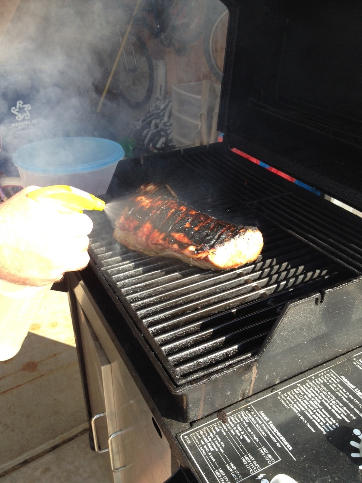 7. In a spray bottle, mix apple cider vinegar and water using a 2/3 parts vinegar and 1/3 water ratio. Spray the loin liberally every 15 minutes to help retain its moisture.